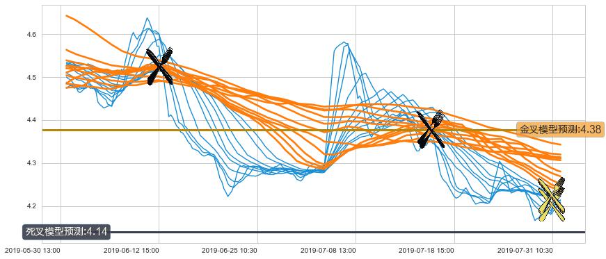➣ 120小时均线于(06-12 15:00: 4.52)形成【死叉】基于【死叉历史模型】预测死叉后最低波谷价格: 4.19, 死叉后最低价格4.15,已经下跌超出预测最低波谷价格, 预期反弹