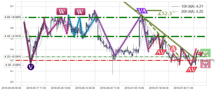 ♘ 阻力价格位4.42,可信任强度92.46%,距离最后交易2019-07-31 15:00形成的收盘价格4.23相差 +4.51%