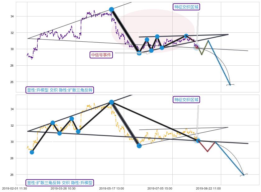 ➣ 下跌螺旋桨 + 扩散三角反转临近支撑猜想转换阻力下跌信号叠加后【目标达成率】低,【看空】信号叠加【存续影响大】