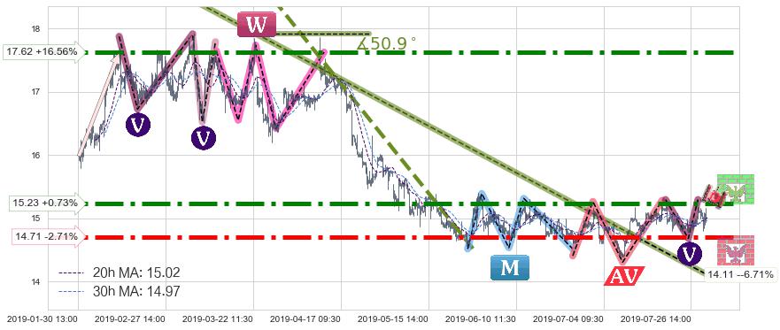 ♘ 阻力价格位15.23,可信任强度87.91%,距离最后交易2019-07-31 15:00形成的收盘价格15.12相差 +0.73%
