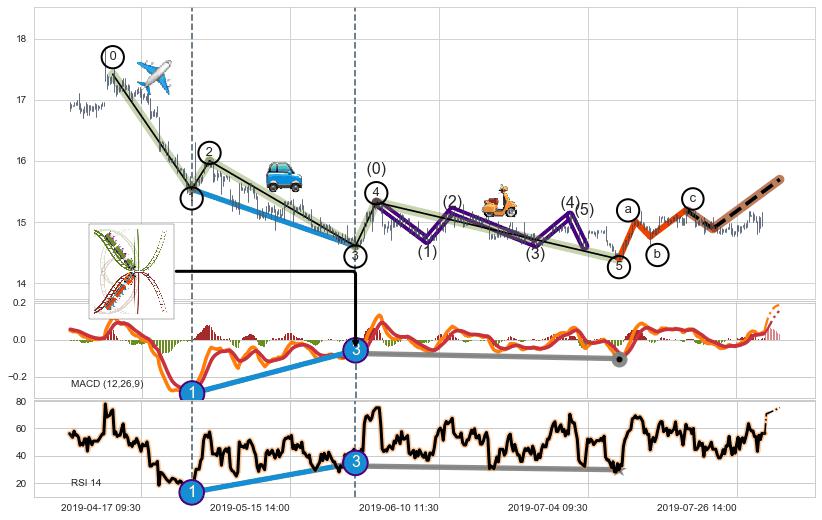 ➣ 第一, 三, 五浪下跌动能逐渐【衰弱变小】,趋势呈现不稳迹象