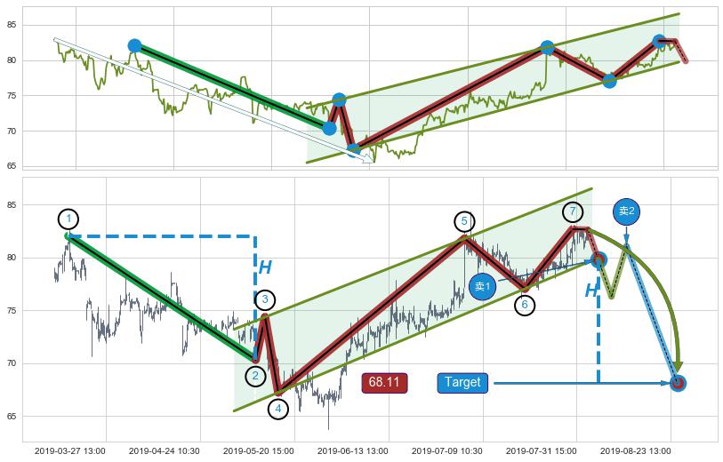 ➣ 升旗形:猜想临近关键支撑位突破点 → 临近拐点下跌 → 风险信号 → 大趋势均值回复