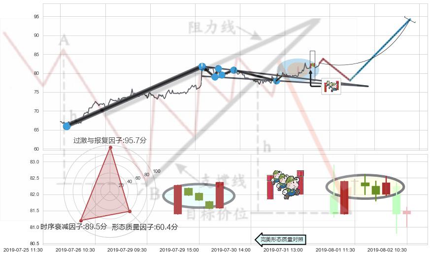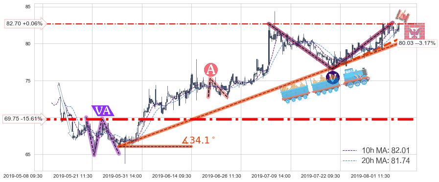 ♘ 在最后的上升阶段2019-05-27 15:00至2019-08-02 14:00存在 持续未破位的支撑位 ,支撑价格80.03,支撑可信任强度82.30%,其距离最后价格82.65相差 -3.17%