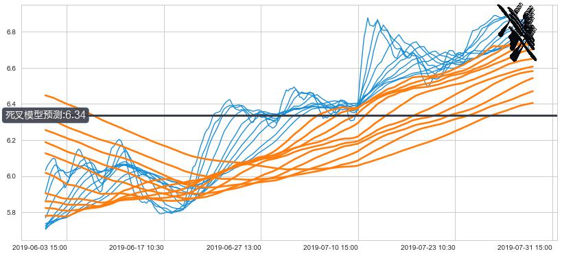 ➣ 70小时均线于(07-31 09:30: 6.73)形成【死叉】基于【死叉历史模型】预测死叉后最低波谷价格: 6.28, 死叉后最低价格6.62,尚未达到预测最低波谷价格, 预期继续下跌