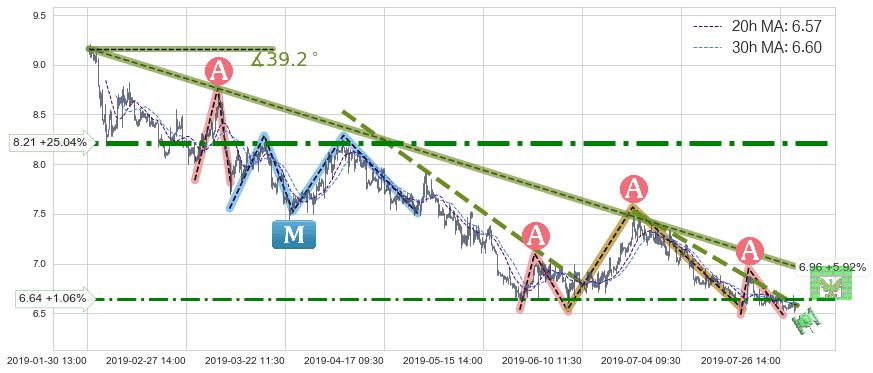 从2019-01-30 15:00至2019-07-31 15:00,共包含718个小时,阶段股价下跌-30.85%,阶段股价变动位移路程比: 1 : 13,下跌趋势角度: 39.2