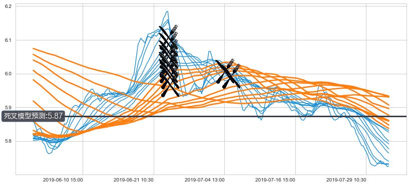 ➣ 70小时均线于(06-24 15:00: 6.01)形成【死叉】基于【死叉历史模型】预测死叉后最低波谷价格: 5.89, 死叉后最低价格5.71,已经下跌超出预测最低波谷价格, 预期反弹