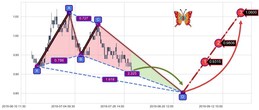 ➣ 未完成【蝴蝶】形态起点X: 06-14:10, 已到达C点: 07-15:15, 预测最终D点: 08-23:13, 共292交易小时