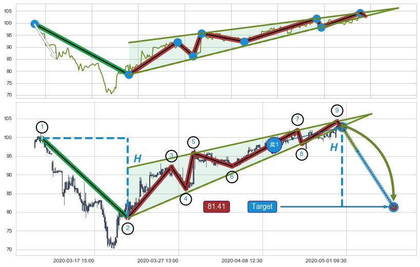➣ 升楔型:猜想临近关键支撑位突破点 → 临近拐点下跌 → 风险信号 → 大趋势均值回复