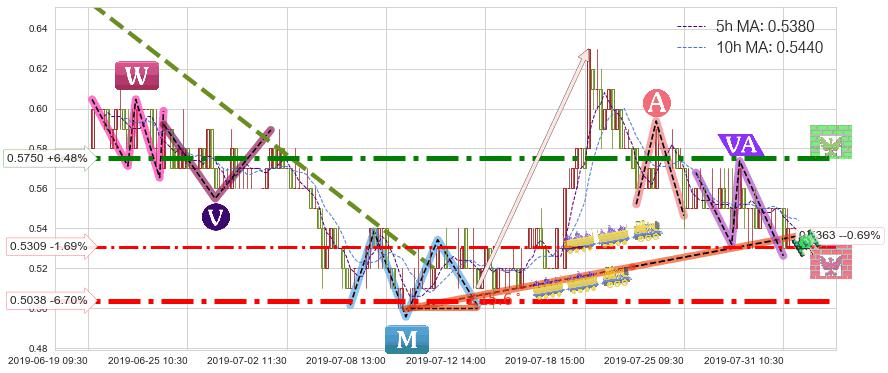 ♘ 支撑价格位0.5309,可信任强度56.38%,距离最后交易2019-07-31 15:00形成的收盘价格0.5400相差 -1.69%