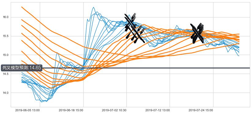 ➣ 70小时均线于(07-03 09:30: 15.62)形成【死叉】基于【死叉历史模型】预测死叉后最低波谷价格: 14.82, 死叉后最低价格14.96,虽然还未下跌超出预测最低波谷价格, 但横盘时间过长, 预期反弹