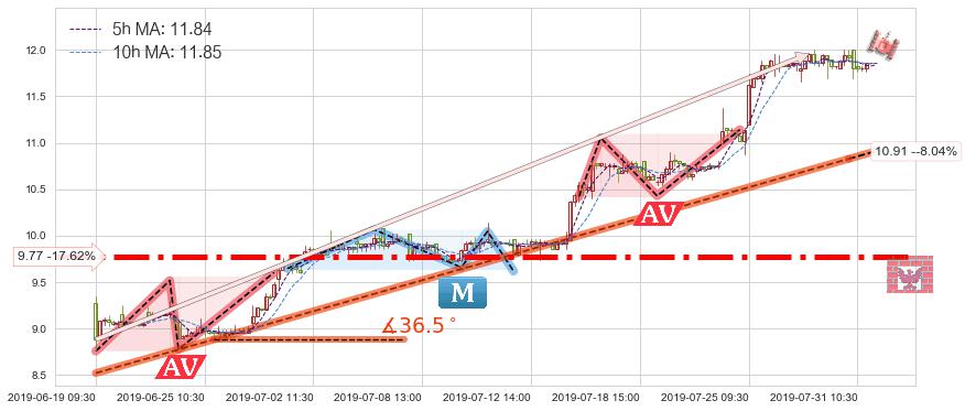 2019-07-12: 第一支撑位9.77有效抑制了下跌浪,成功阻止了价格的继续下跌。