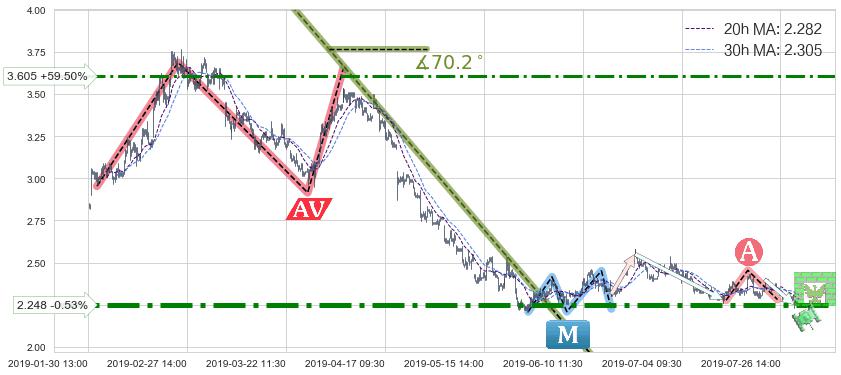 从2019-02-25 09:30至2019-05-31 09:30,共包含385个小时,阶段股价下跌-43.30%,阶段股价变动位移路程比: 1 : 6,下跌趋势角度: 70.2