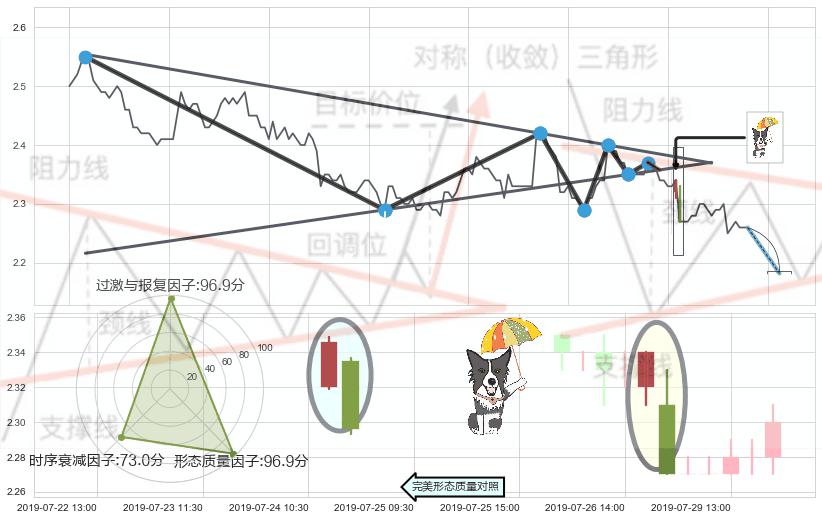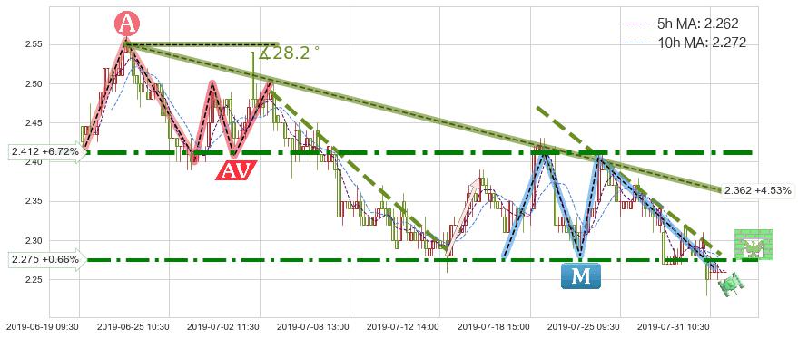 ♘ 在最后的下跌阶段2019-06-21 10:30至2019-07-31 14:00,存在 持续未破位的阻力位 ,阻力价格2.362,可信任强度86.62%,其距离最后价格2.260相差 +4.53%
