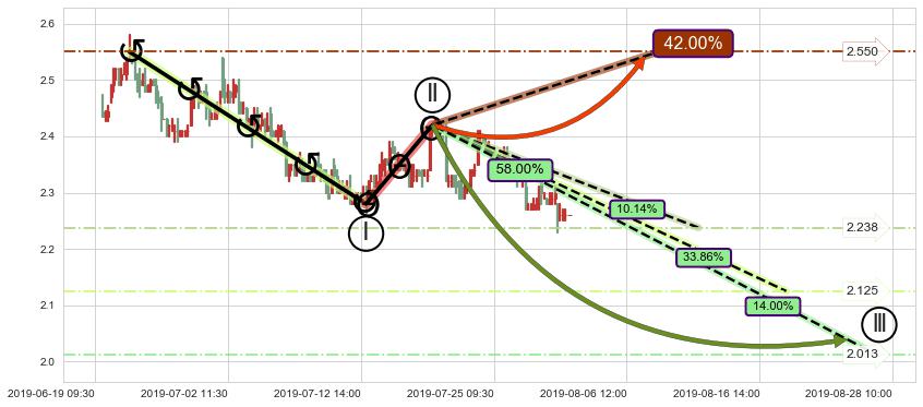 ➣ 调整浪已超过预测的c点位置,后续大趋势循环浪继续下跌概率58.00%,谨慎做多
