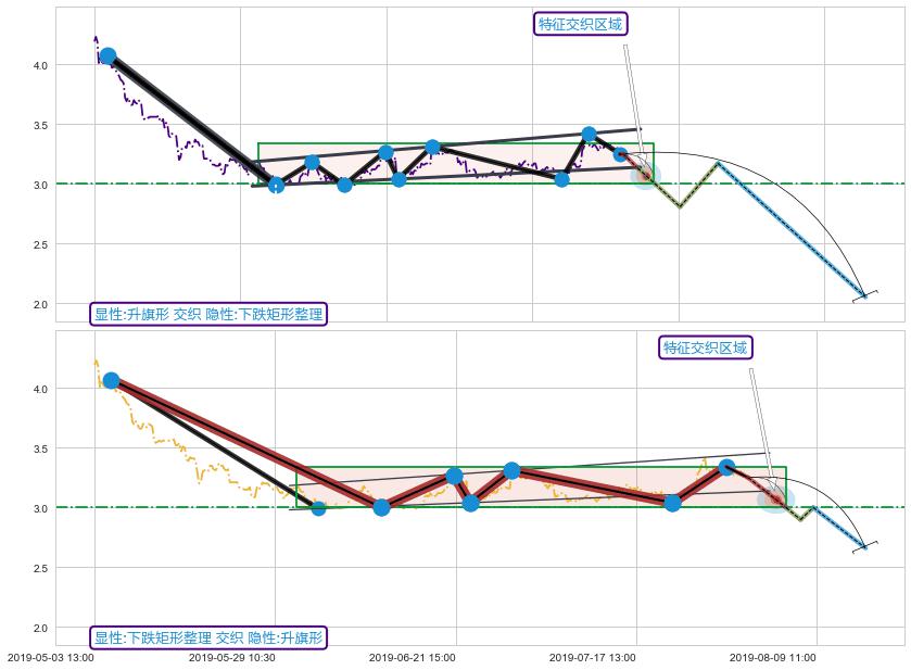 ➣ 下跌矩形整理:猜想临近关键支撑位突破点 → 临近拐点下跌 → 风险信号 → 大趋势均值回复