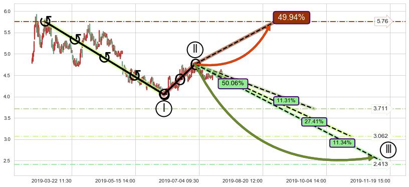 从2019-06-05 14:00至2019-06-17 15:00,共包含44个小时,阶段股价上涨3.87%,阶段股价变动位移路程比: 1 : 6