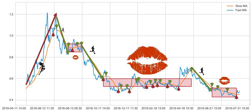 07-16 09:30至08-10 13:00 慢线与快线多次接触,存在上下穿越,有缠绕
