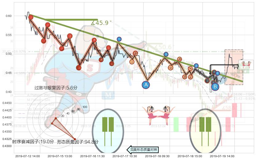 ➣ 2019-05-06 10:30-2019-07-26 09:30下跌趋势存在反转上涨[机会],其原下跌趋势的阻力位(0.42706)已被突破[强支撑信号],原下跌趋势角度: 45.9˚