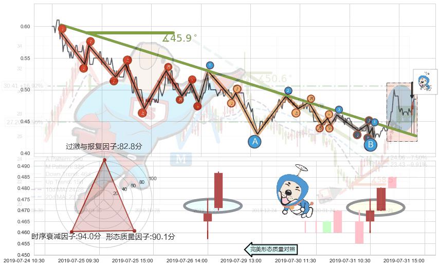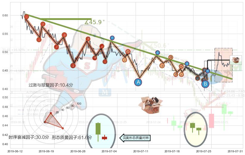 ➢ 2019-05-06 10:30-2019-07-26 09:30下跌趋势存在反转上涨[机会],其原下跌趋势的阻力位(0.42706)已被突破[强支撑信号],原下跌趋势角度: 45.9˚