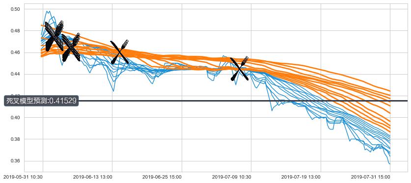 ➣ 120小时均线于(06-14 11:30: 0.45971)形成【死叉】基于【死叉历史模型】预测死叉后最低波谷价格: 0.40328, 死叉后最低价格0.35000,已经下跌超出预测最低波谷价格, 预期反弹
