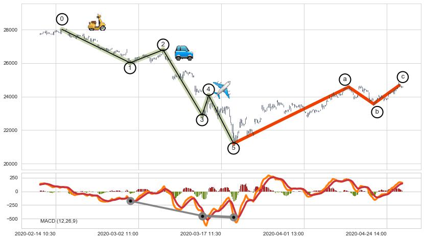 ➣ 波浪理论:猜想达到c点后小反弹终止反转下跌 → 下跌 → 【拐点】临近 → 阶段均值回复结束后继续大周期趋势跟踪
