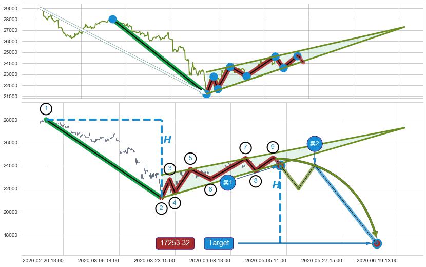 ➣ 升楔型:猜想临近关键支撑位突破点 → 临近拐点下跌 → 风险信号 → 大趋势均值回复