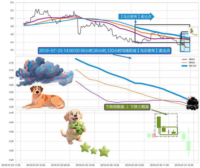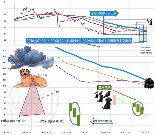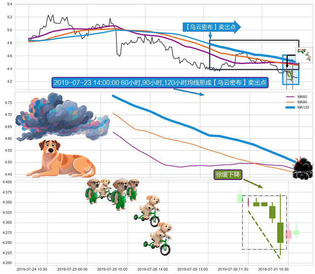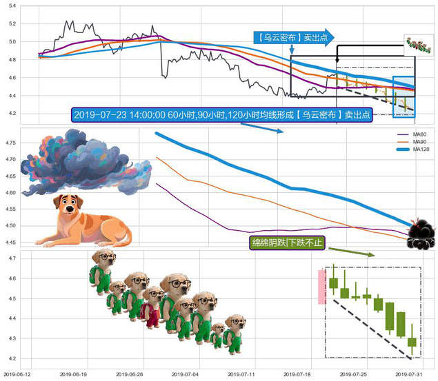 ➣ 2019-07-15 11:30:00小时-2019-07-31 15:00:00小时显现 60小时-90小时-120小时均线 【乌云密布】卖出点 看空信号,后市看跌,卖出