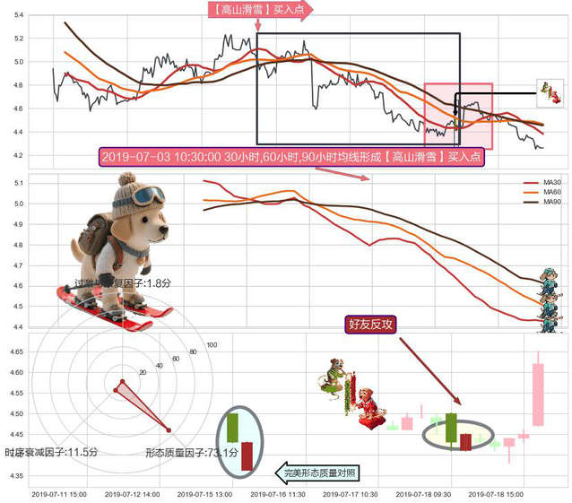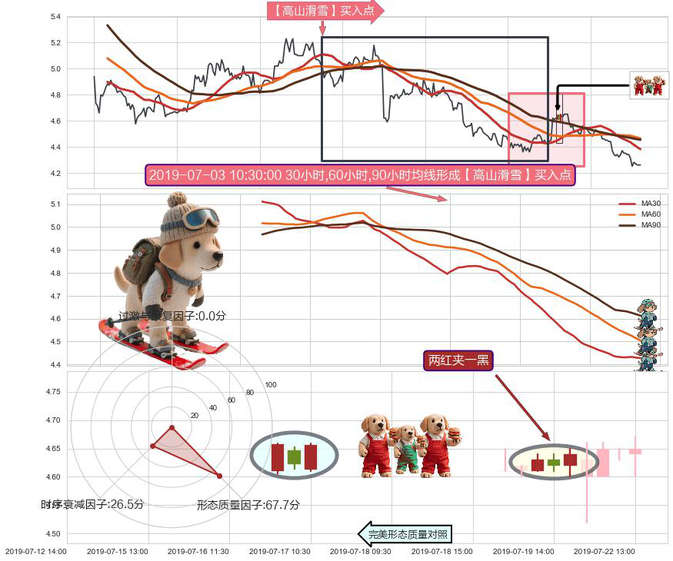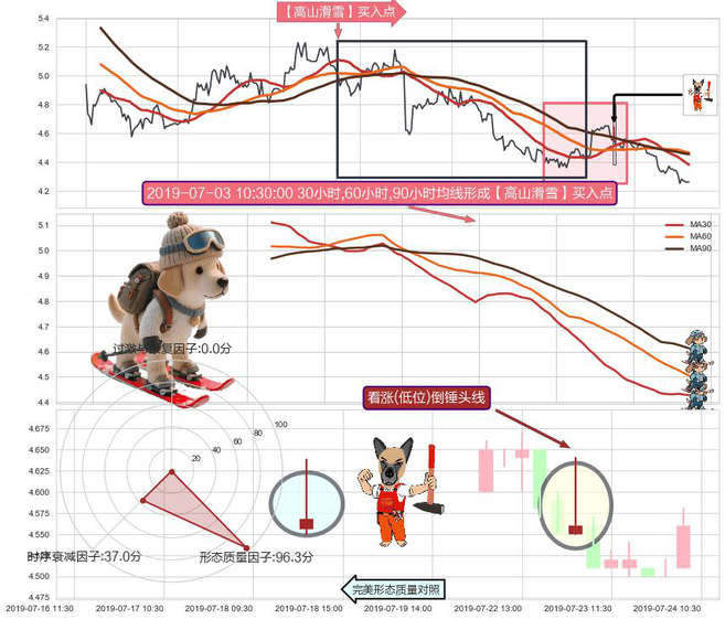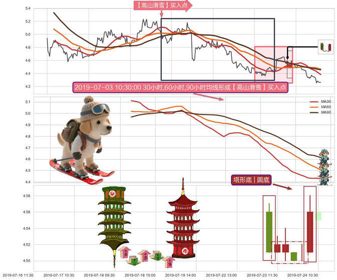 ➣ 2019-06-14 15:00:00小时-2019-07-18 11:30:00小时显现 30小时-60小时-90小时均线 【高山滑雪】买入点 看多信号,后市看涨,买入