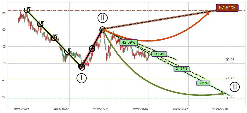 ➣ 循环浪继续向下【平均值】位置(2023-02-27, 45.30),匹配聚类样本比例51.12%, 可能性概率21.67%