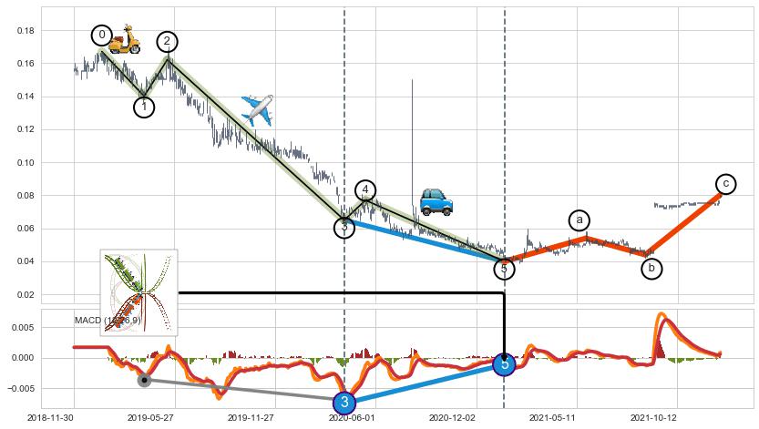 ➣ 波浪理论:猜想达到c点后小反弹终止反转下跌 → 下跌 → 【拐点】临近 → 阶段均值回复结束后继续大周期趋势跟踪