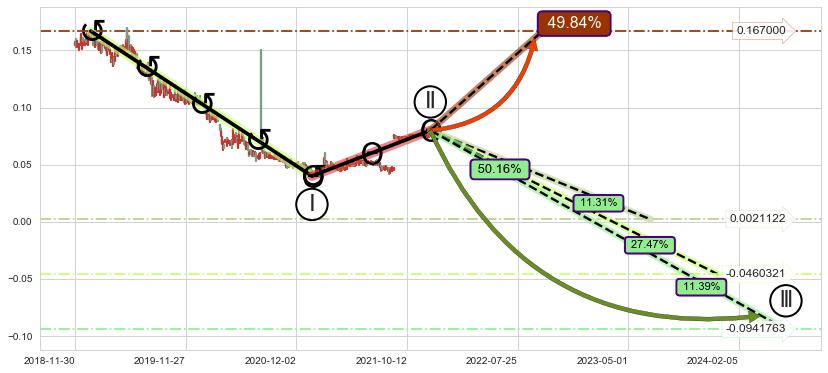 ➣ 循环浪继续向下【平均值】位置(2023-12-13, -0.0460321),匹配聚类样本比例54.75%, 可能性概率27.47%