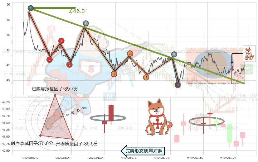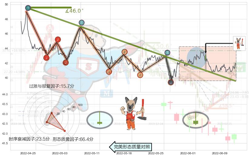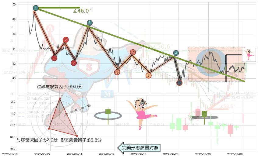 ➣ 2021-03-10-2022-05-19下跌趋势存在反转上涨[机会],其原下跌趋势的阻力位(39.57)已被突破[强支撑信号],原下跌趋势角度: 46.0˚
