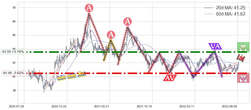 ♘ 支撑价格位40.48,可信任强度92.45%,距离最后交易2022-08-12形成的收盘价格42.00相差 -3.62%