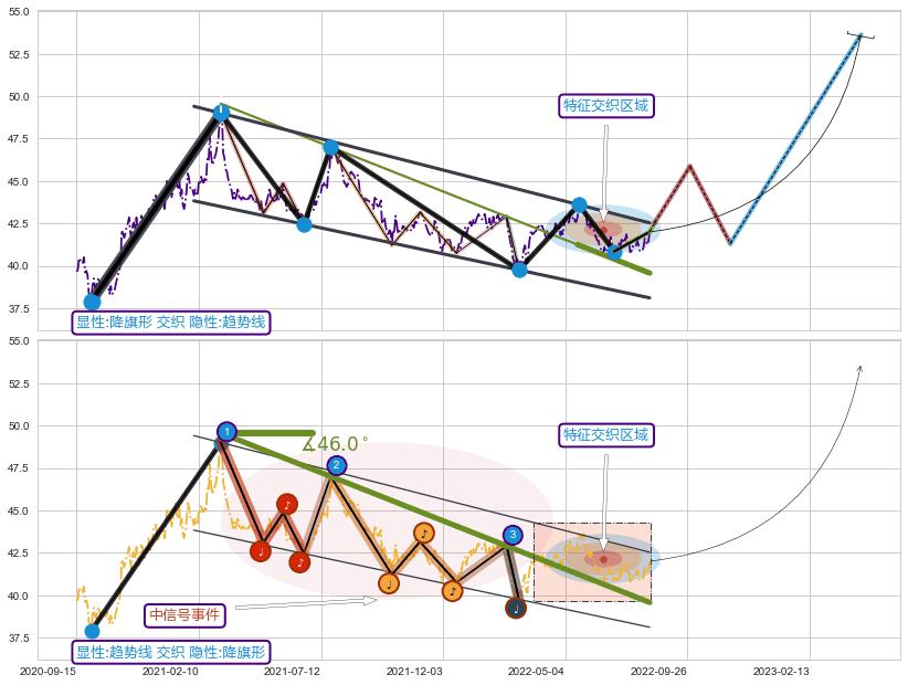 ➢ 2021-03-10-2022-05-19下跌趋势存在反转上涨[机会],其原下跌趋势的阻力位(39.57)已被突破[强支撑信号],原下跌趋势角度: 46.0˚