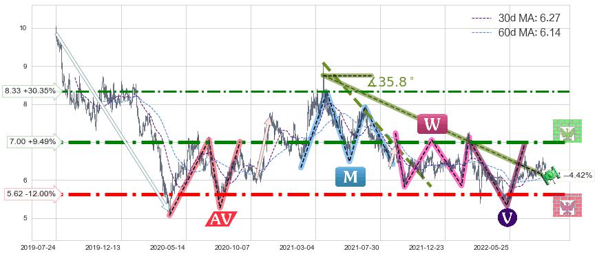 ♘ 阻力价格位7.00,可信任强度88.43%,距离最后交易2022-08-12形成的收盘价格6.39相差 +9.49%