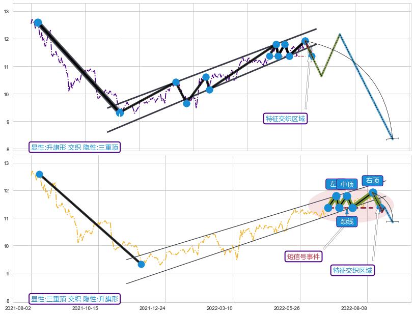 ➣ 升旗形:猜想临近关键支撑位突破点 → 临近拐点下跌 → 风险信号 → 大趋势均值回复