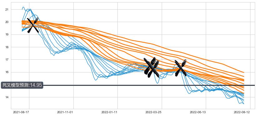 ➣ 21小时均线于(2022-04-28: 16.25)形成【死叉】基于【死叉历史模型】预测死叉后最低波谷价格: 14.87, 死叉后最低价格13.28,已经下跌超出预测最低波谷价格, 预期反弹