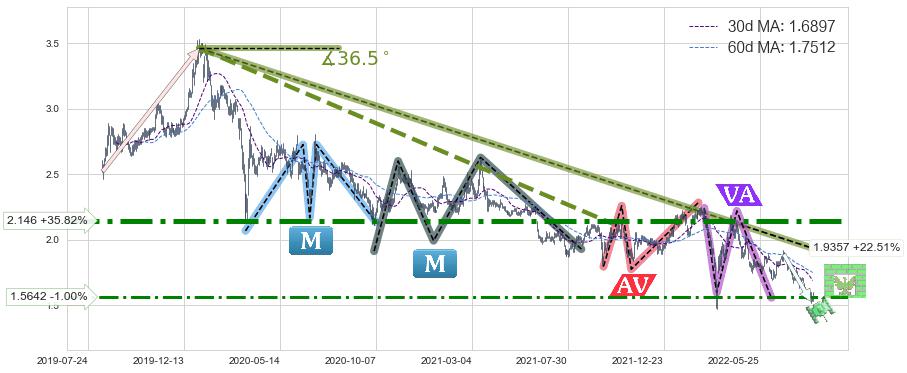 ♘ 在最后的下跌阶段2020-01-09至2022-04-14,存在 持续未破位的阻力位 ,阻力价格1.9357,可信任强度81.13%,其距离最后价格1.5800相差 +22.51%