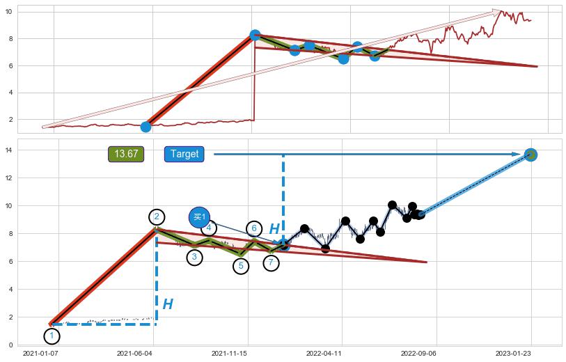 ➣ AI预测: 假定反转启动后, 第❶目标位置(2023-01-03, 8.70)