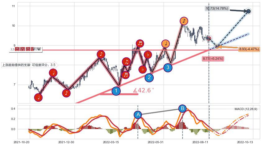 ♘ 阻力价格位9.88,可信任强度71.36%,距离最后交易2022-08-12形成的收盘价格9.35相差 +5.65%