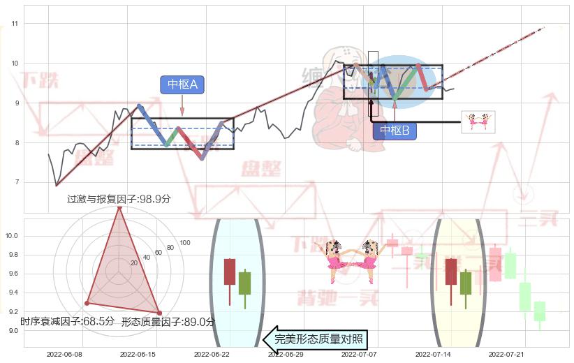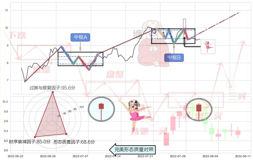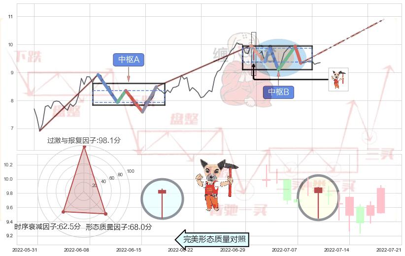 ➣ 【中枢B】:2022-07-08-2022-08-03,中枢由6笔构成,共19交易日, ZG=9.87, ZD=9.38