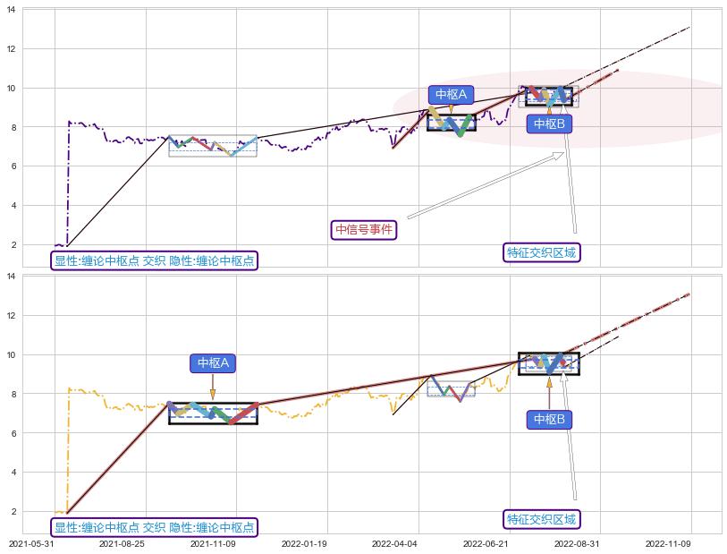➢ 缠论中枢点:猜想突破中枢B后持续拉升 → 上涨 → 突破中枢B阻力 → 持续趋势跟踪