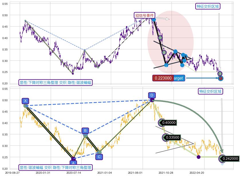 ➢ 下降对称三角整理属【短级别信号事件】谐波蝙蝠属【长级别信号事件】长短周期组合信号事件, 短长事件长度比26.63%