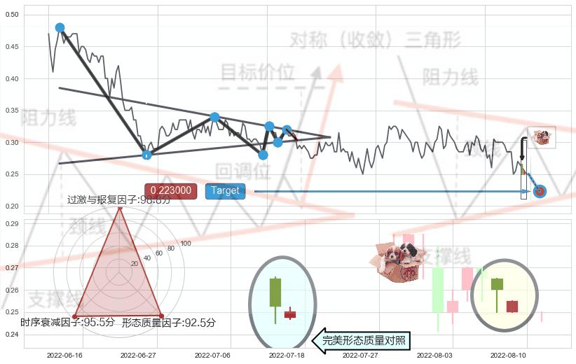 ➢ 曙光初现形态 🔜 下降对称三角整理临近target支撑拐点上涨 综合量化分数:50.43 【中性】