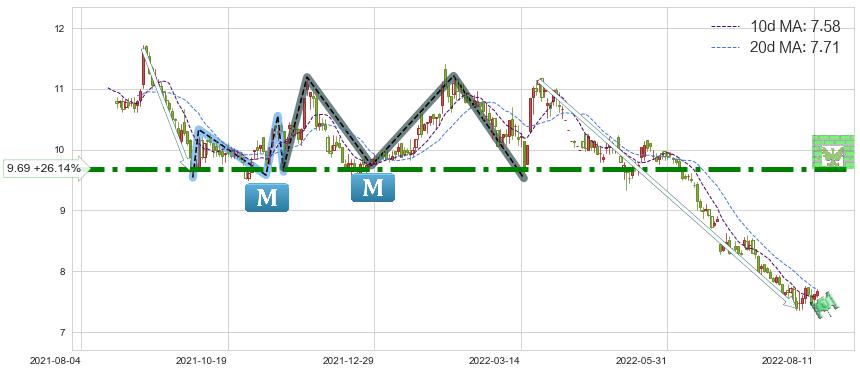 ♘ 阻力价格位9.69,可信任强度90.55%,距离最后交易2022-08-12形成的收盘价格7.68相差 +26.14%