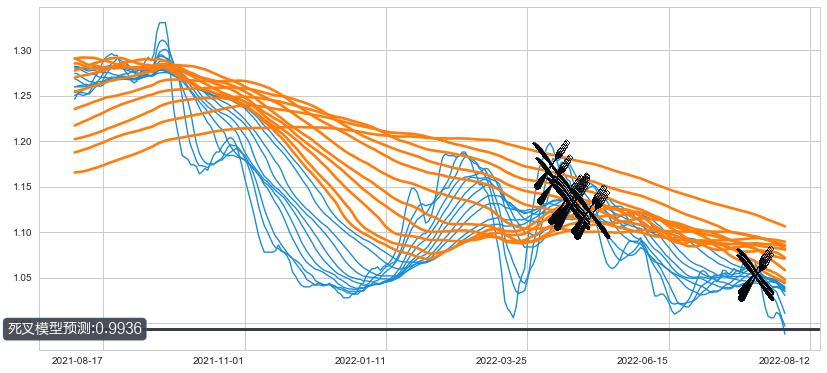 ➣ 70小时均线于(2022-04-22: 1.1279)形成【死叉】基于【死叉历史模型】预测死叉后最低波谷价格: 0.9953, 死叉后最低价格0.9600,已经下跌超出预测最低波谷价格, 预期反弹
