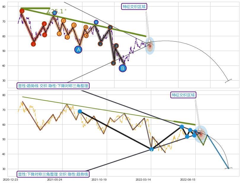 ➢ 趋势线与下降对称三角整理信号事件周期长度级别相同,同周期信号事件