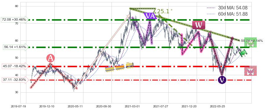 ♘ 阻力价格位56.14,可信任强度88.54%,距离最后交易2022-08-12形成的收盘价格55.25相差 +1.61%