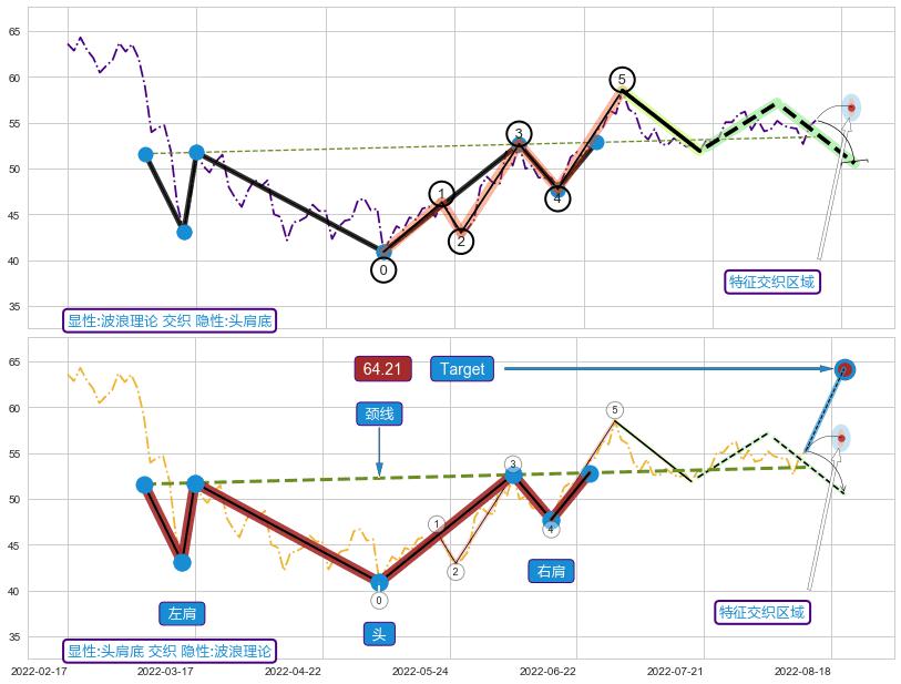 ➢ 头肩底临近target阻力拐点下跌 🔜 波浪理论临近C点后破位C下跌 综合量化分数:46.38 【中性】