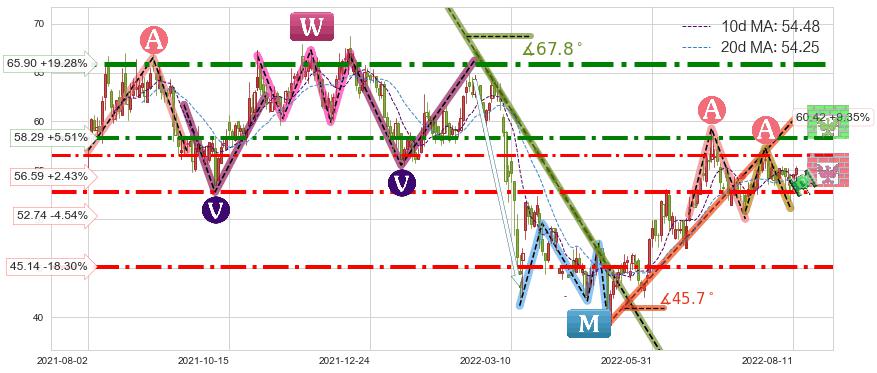 ♘ 阻力价格位58.29,可信任强度82.99%,距离最后交易2022-08-12形成的收盘价格55.25相差 +5.51%